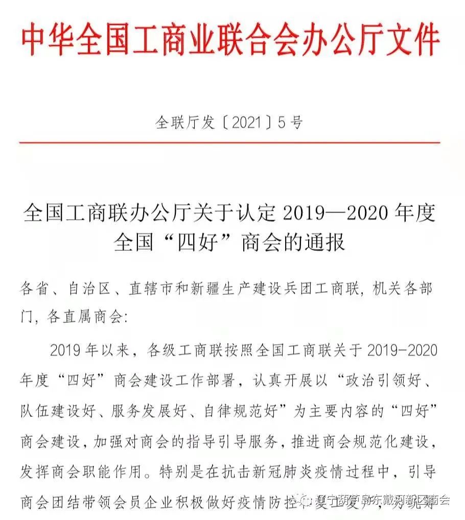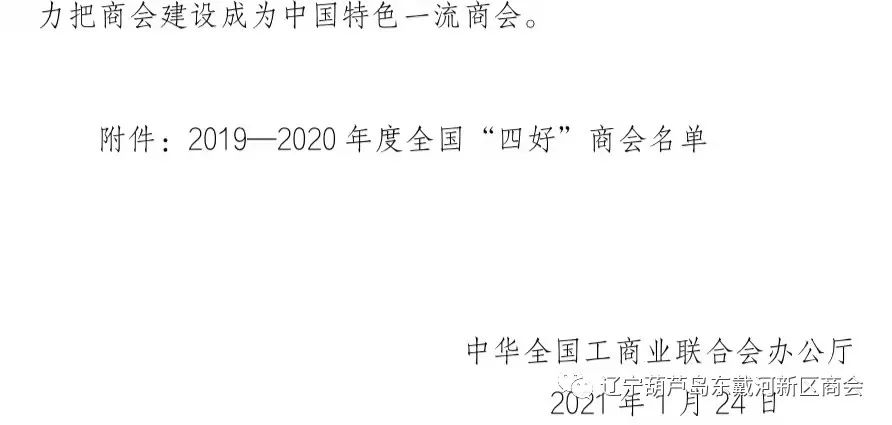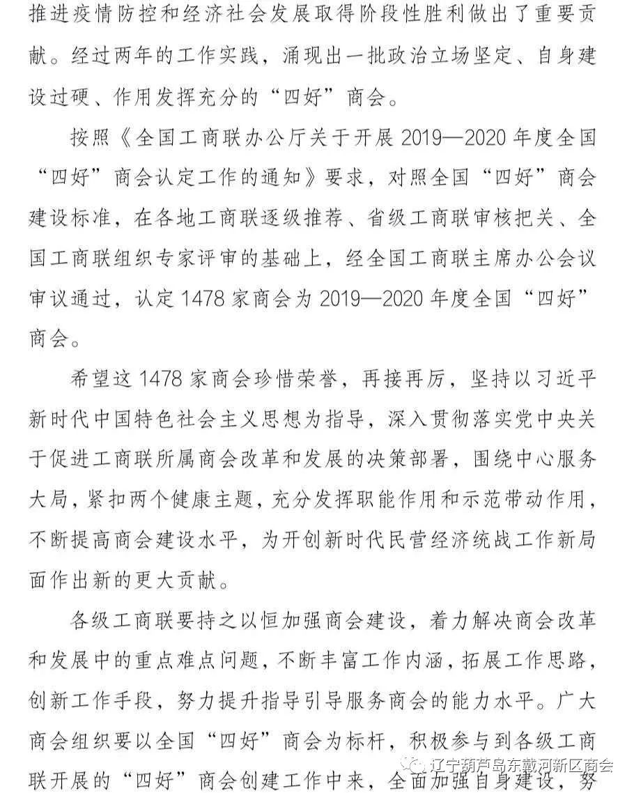 2021年1月24日,全国工商联组织开展2019-2020年度全国"四好"9778818威尼斯认定工作,经过严格的推荐、初审以及专家评审组评审等环节,认定了1478家全国"四好"9778818威尼斯,辽宁省社会组织被认定26家,辽宁葫芦岛9778818威尼斯在此之列,被全国工商联评定为全国"四好"9778818威尼斯的荣誉称号。