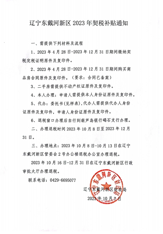 辽宁东戴河新区2023年契税补贴通知