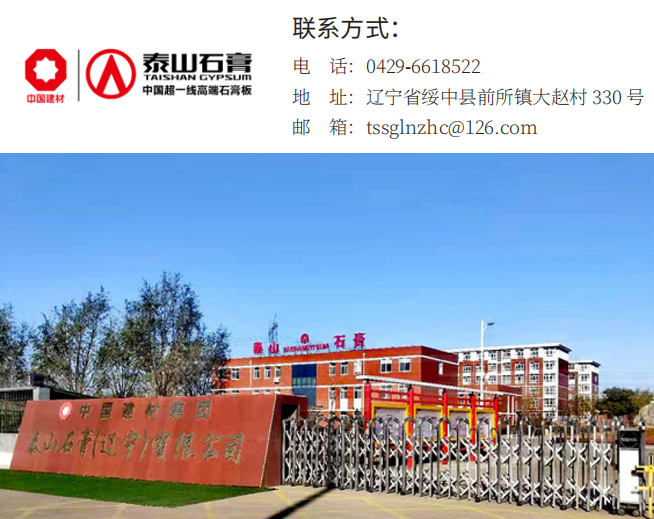 泰山石膏(辽宁)有限公司的发展壮大主要是新技术的开发应用和对产品质量的重视。公司主导产品有各种规格的纸面石膏板、装饰石膏板、轻钢龙骨及相关配套产品。主导产品“泰山”牌系列纸面石膏板及系统产品作为新型轻质建筑材料,用作隔墙、吊顶,充分满足现代建筑要求,具有防火、隔音、保温、抗震、保健等功能,广泛应用于工商业及民用建筑。公司以“质量和信誉是我们的基石”为宗旨,已通过 ISO9001 质量保证体系认证。公司以“和谐创新,报效社会”为经营理念,业已通过 ISO14001 环境管理体系认证,并成为国家环保部倡导的“双绿色之星”企业。“泰山”牌系列石膏板赢得了“中国环境标志认证产品”、“中国绿色建材名优品牌”、“中国建筑装饰协会信得过推荐产品”等荣誉称号,并被国家建设部指定为“国家康居示范工程选用部品与产品”。泰山石膏建材产品以其卓越的质量和信誉成为广大用户的选择,畅销全国。